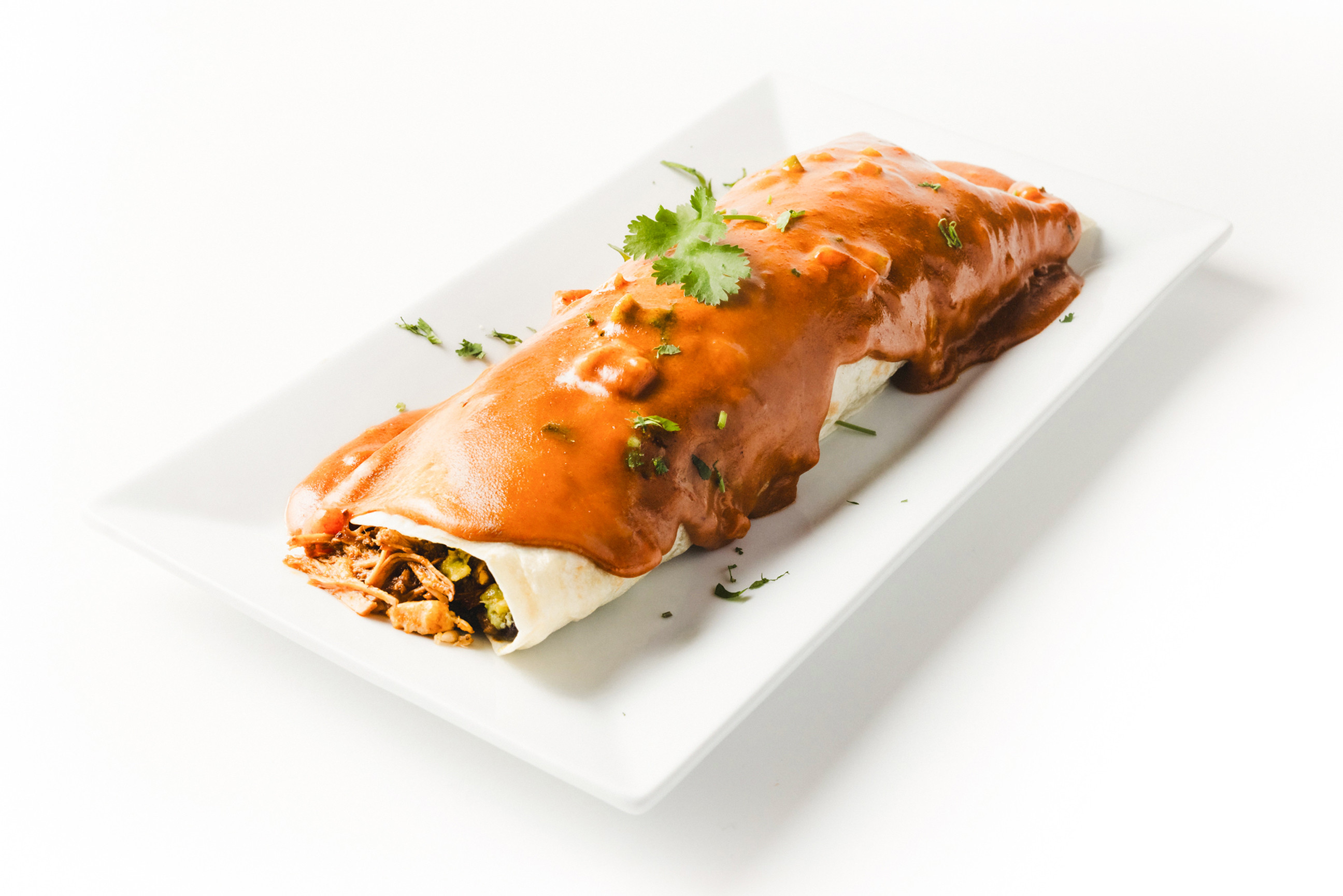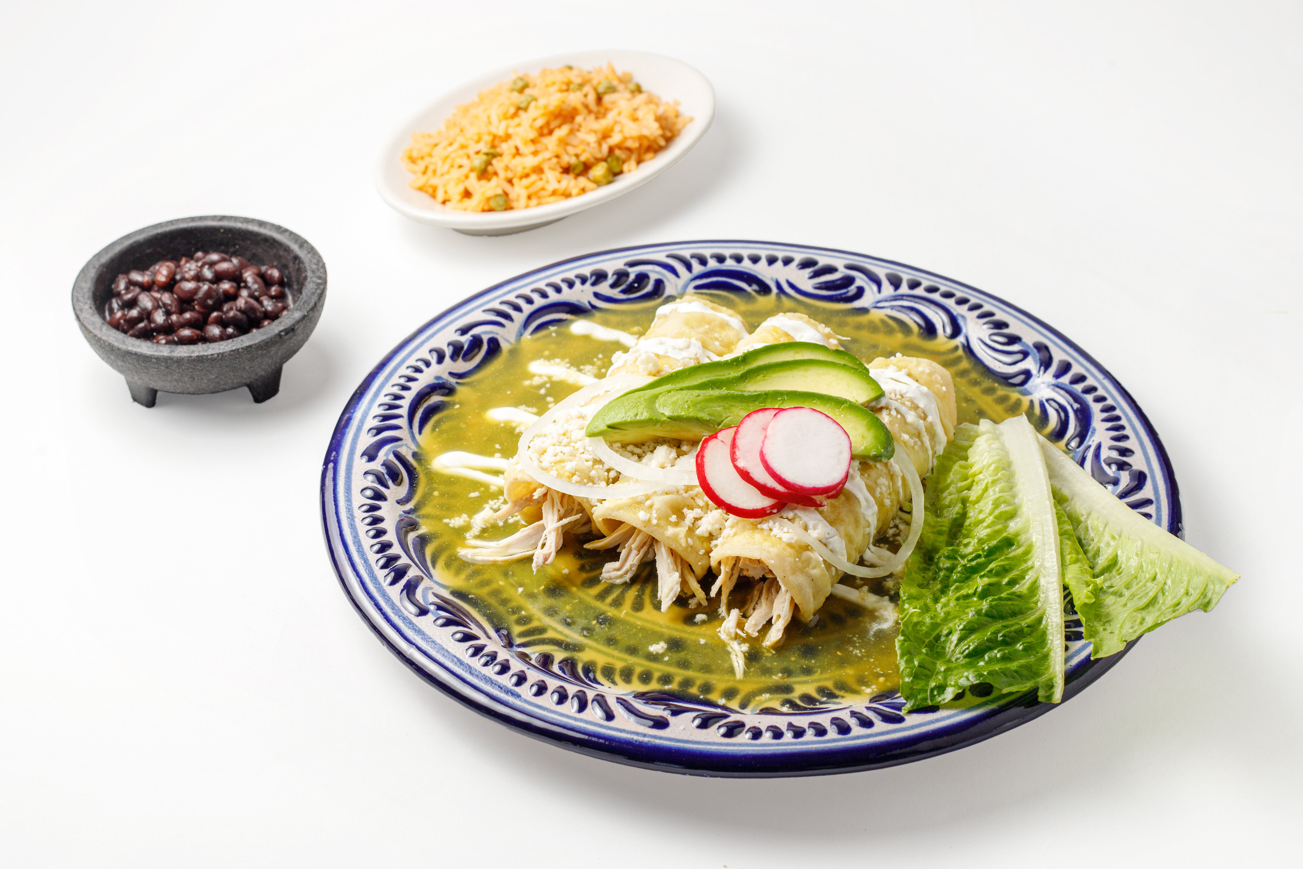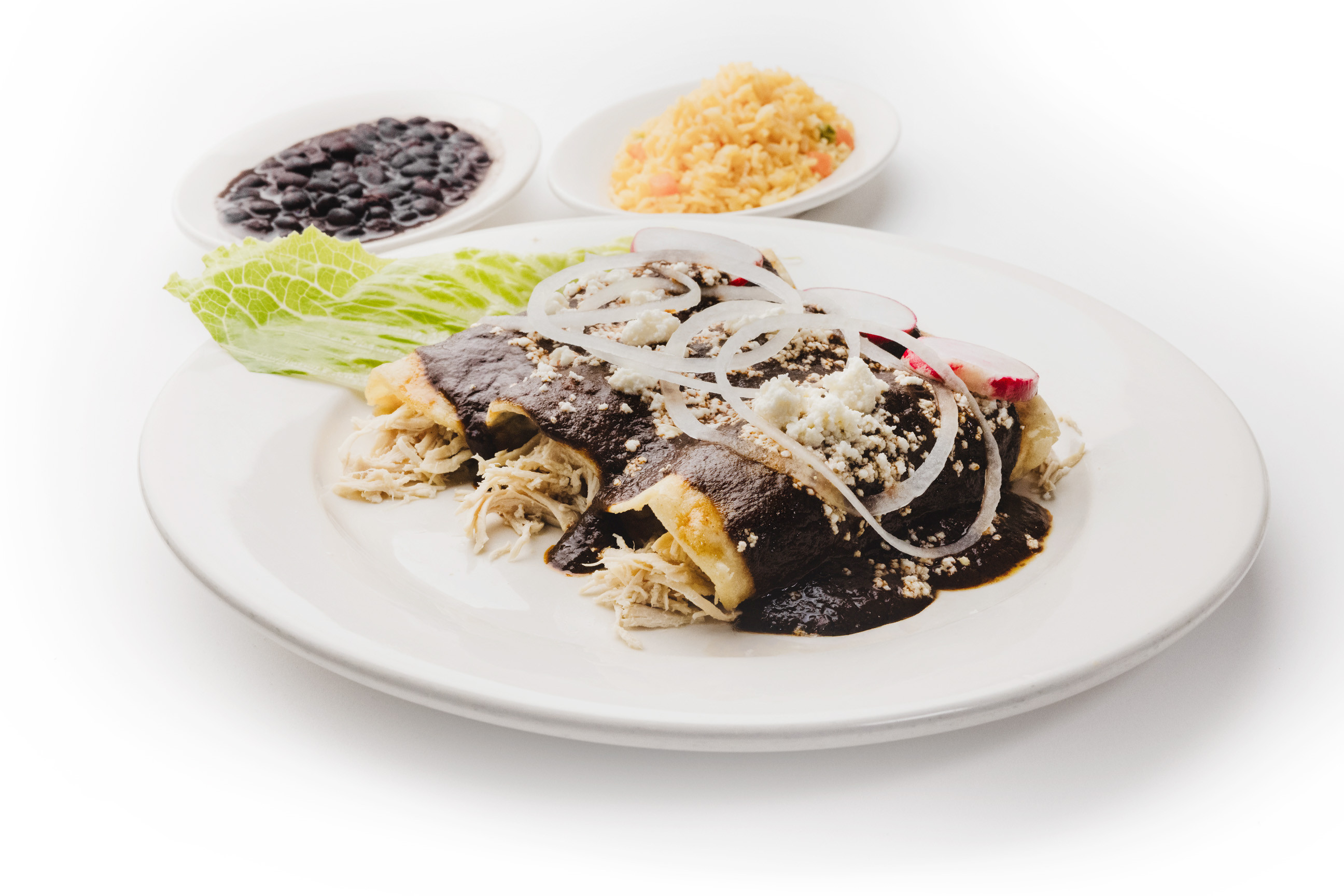 Three corn tortillas, rolled and filled with either meat or vegetables, are topped with our signature Mole Poblano sauce. Garnished with queso fresco, onions, and radishes, this dish is accompanied by a side of rice and beans, providing a blend of rich, creamy, and fresh flavors.
