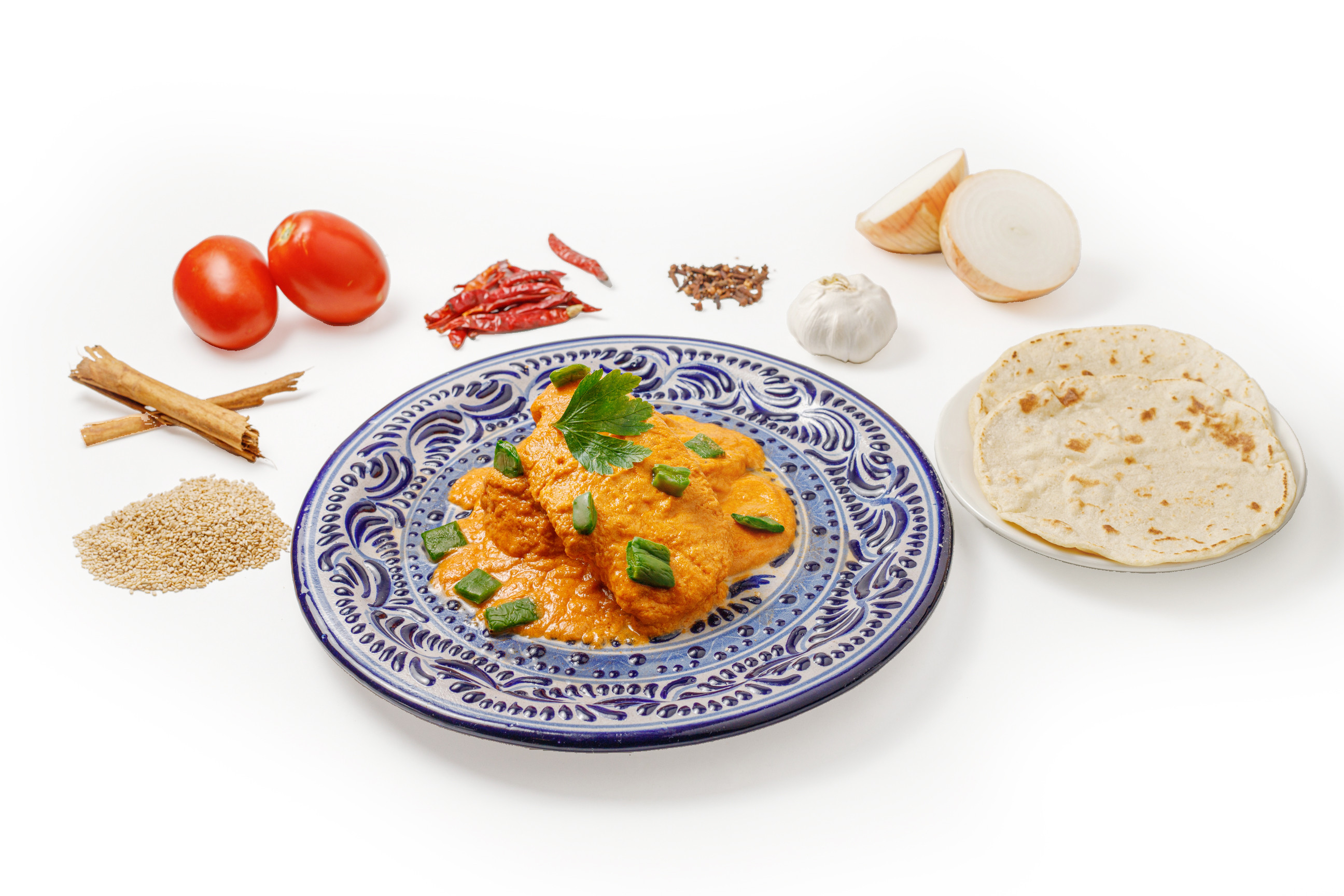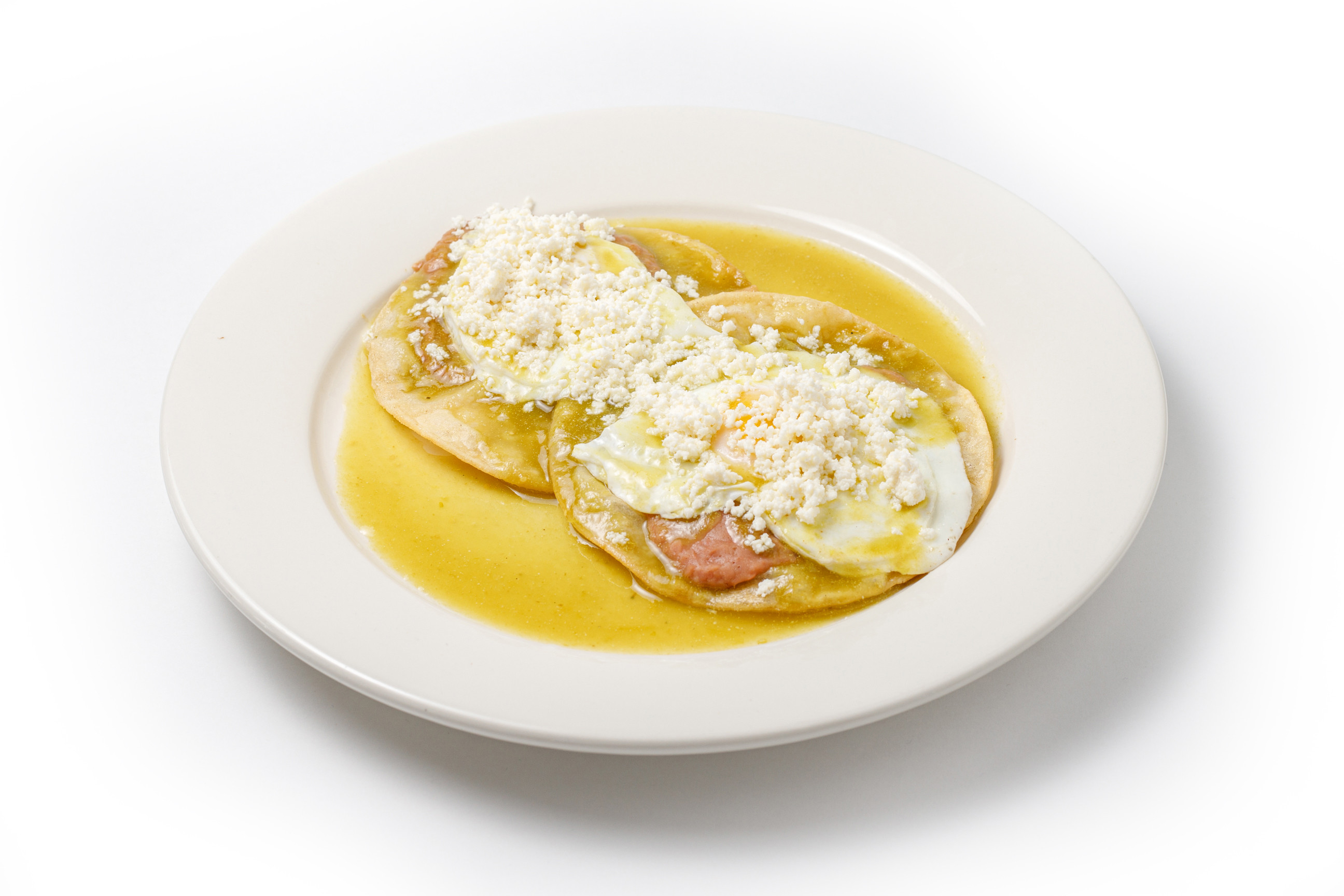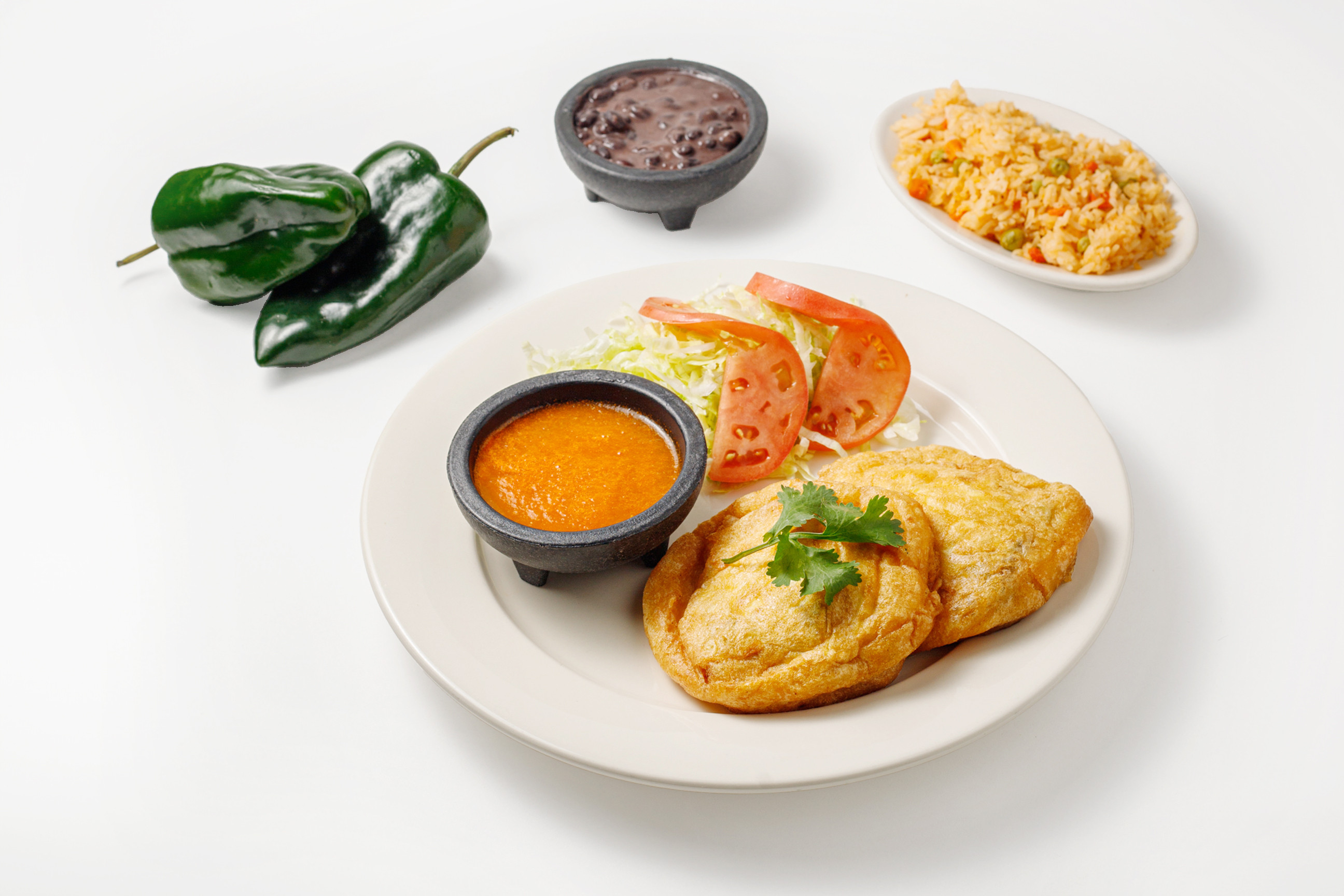 Three corn tortillas, rolled and filled with either meat or vegetables, are topped with our signature Mole Poblano sauce. Garnished with queso fresco, onions, and radishes, this dish is accompanied by a side of rice and beans, providing a blend of rich, creamy, and fresh flavors.