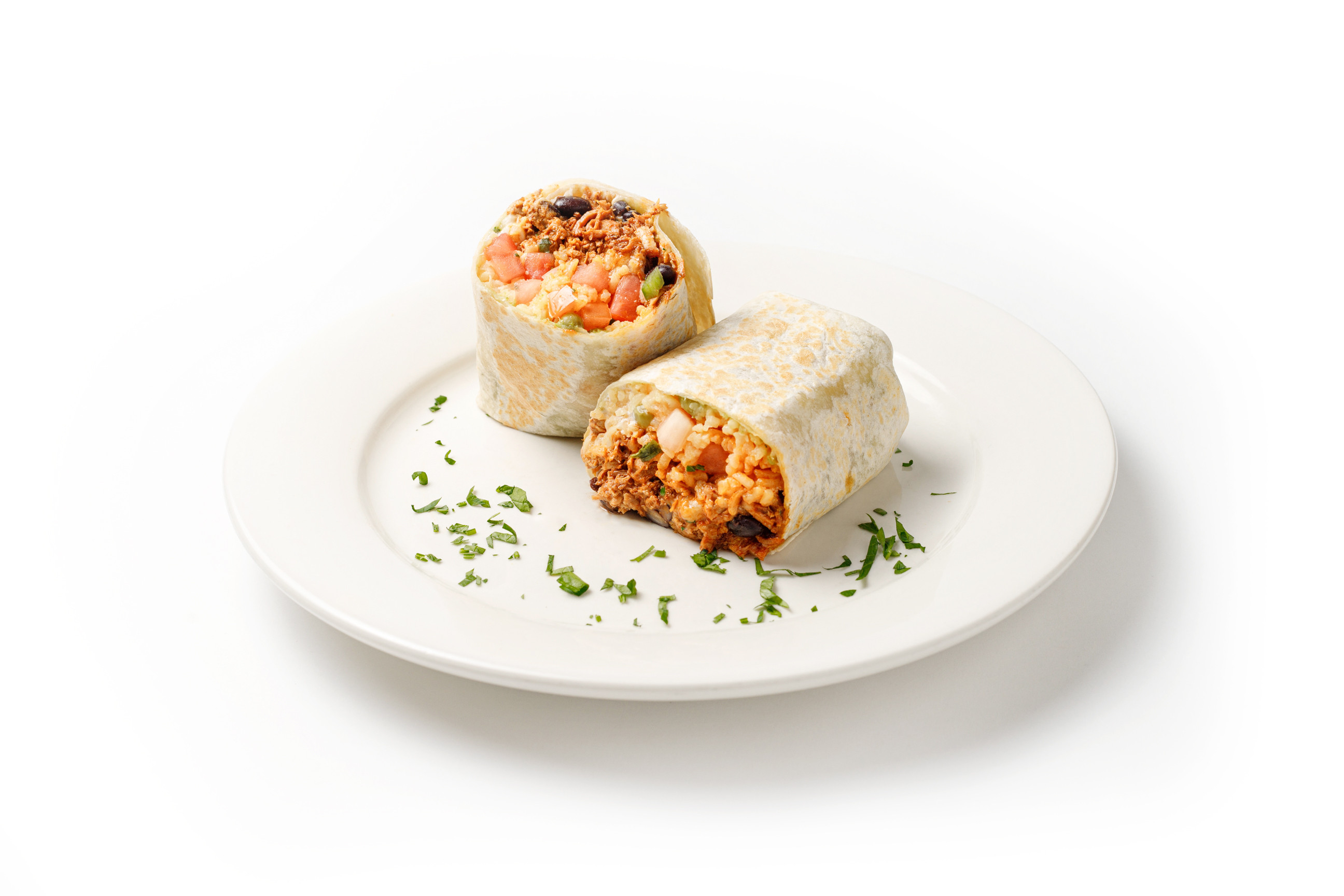 Flour tortilla, rice, beans, pico de gallo, guacamole, cheese and sour cream